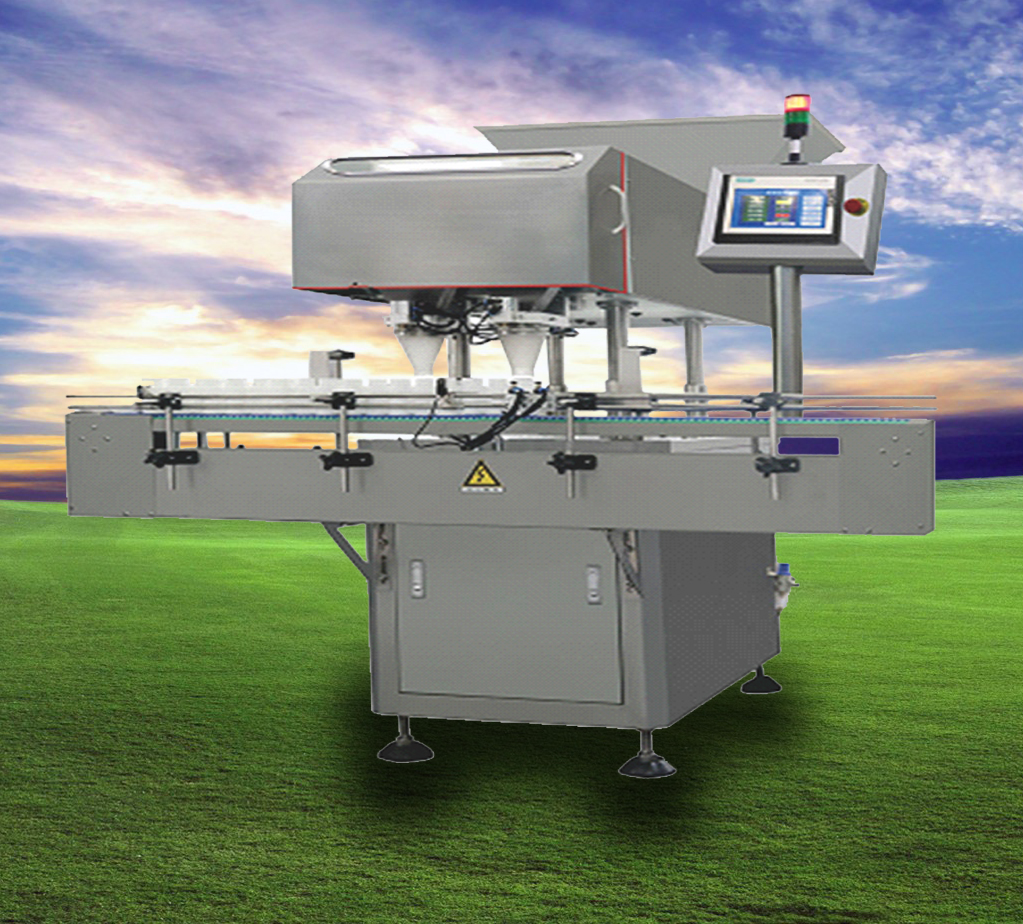 The block bottle device on the passing bottle-track of the conveying bottle system make the bottles which came from the previous equipment stay in the bottling position, waiting to be filled in. The medicine goes into the medicine container in order by the vibration of the feeding corrugated plate. There’s a counting photoelectric sensor installed on the medicine container, after counting of the medicine in the medicine container by the counting photoelectric sensor, the medicine goes into the bottle in the bottling position.