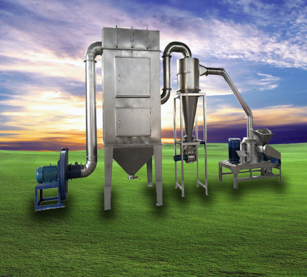 The raw material is delivered to the grinding chamber via hopper by spiral feeder, the raw material is cut and sheared by the high speed cutters, then the material is moved into the whirl wind separator and the sack dust catcher by the negative pressure sucking method, the dust is collected and recycled via cloth bag or filter of dust absorption box, there is no dust flying during production, so as to improve the utilization and decrease the production cost