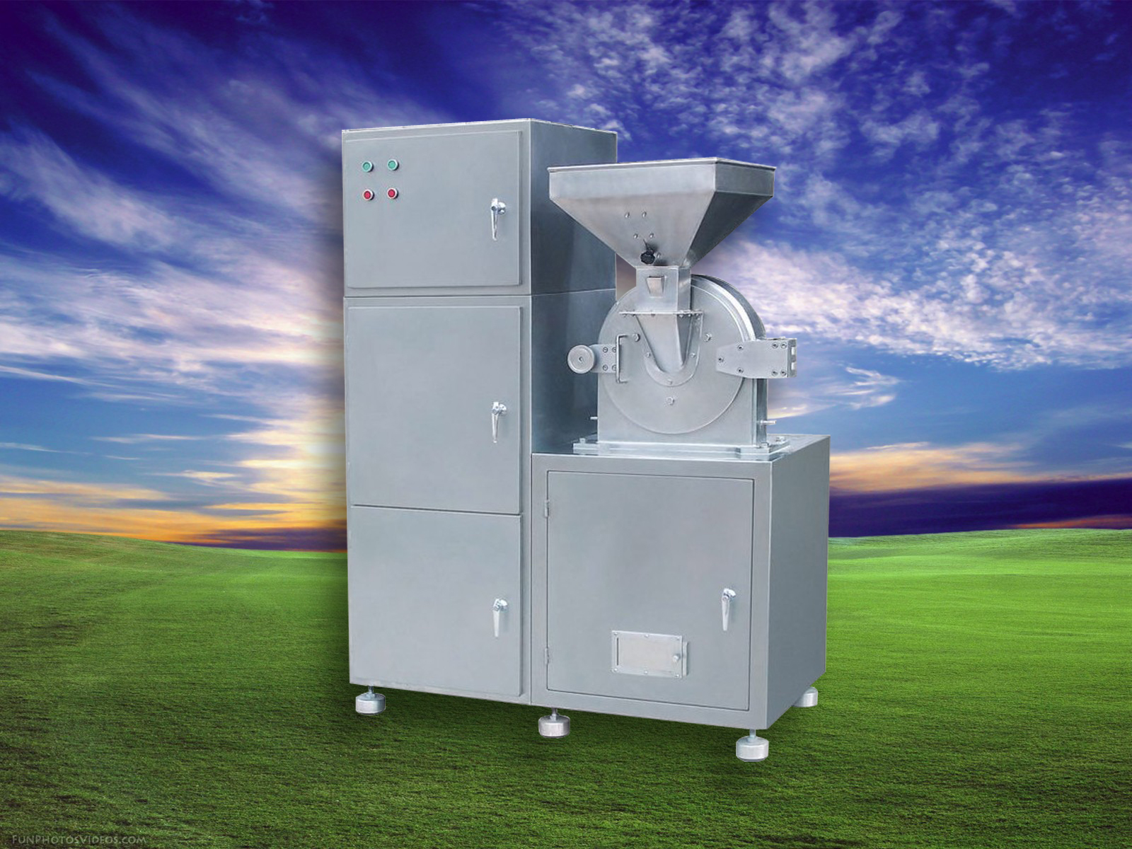 The machine uses the relative movement between the active fluted disc and the fixed fluted disc to impact, grind and crush the target materials. The crushed material can enter the collection box by the centrifugal force, The dust from grinding is filtered and recycled via the cloth bag or filter of the dust absorption box. The whole machine, designed according to GMP standard, is made of stainless steel, thus to avoid dust flying, improve the utilization of raw material and decrease the production cost. Currently, the machine has been on the world advanced level.